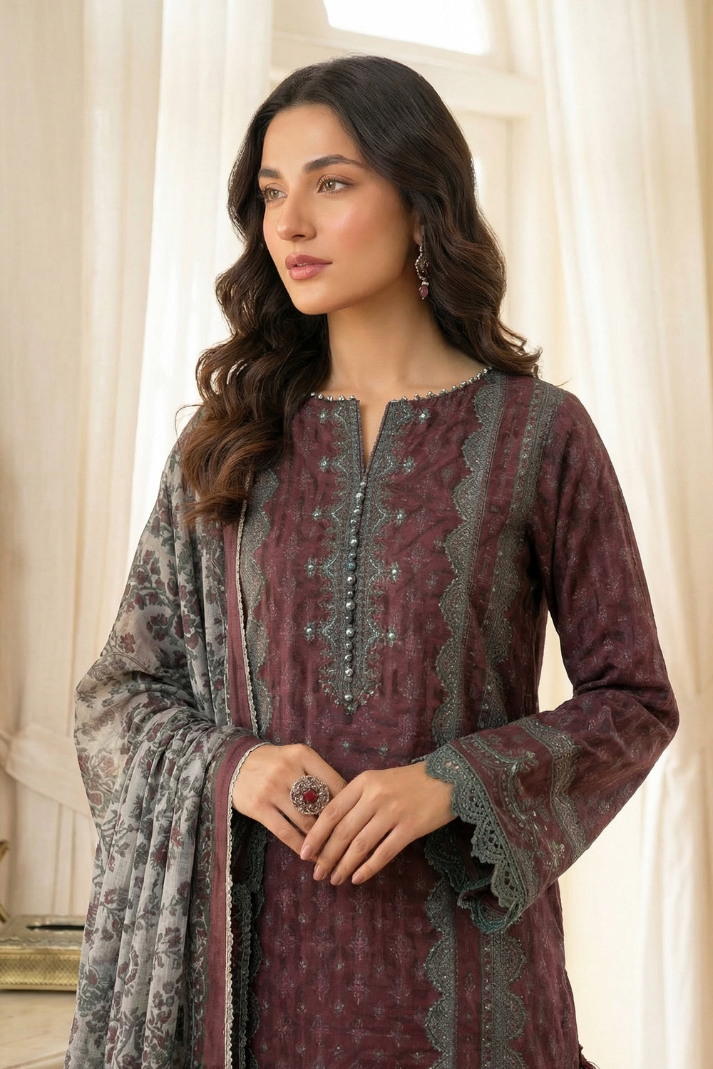 3 Piece Unstitched Vivid Burgundy Premium Printed Lawn