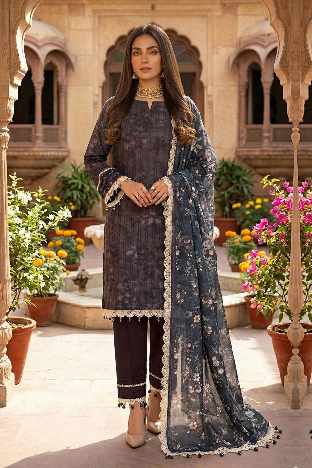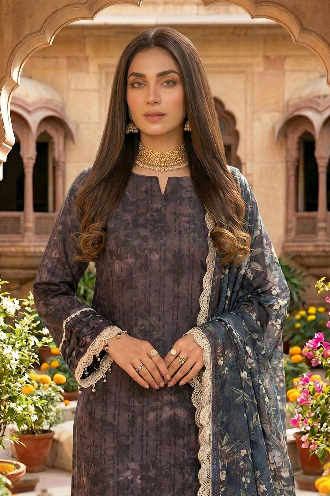 Purple Taupe 3 Piece Unstitched Premium Printed Lawn