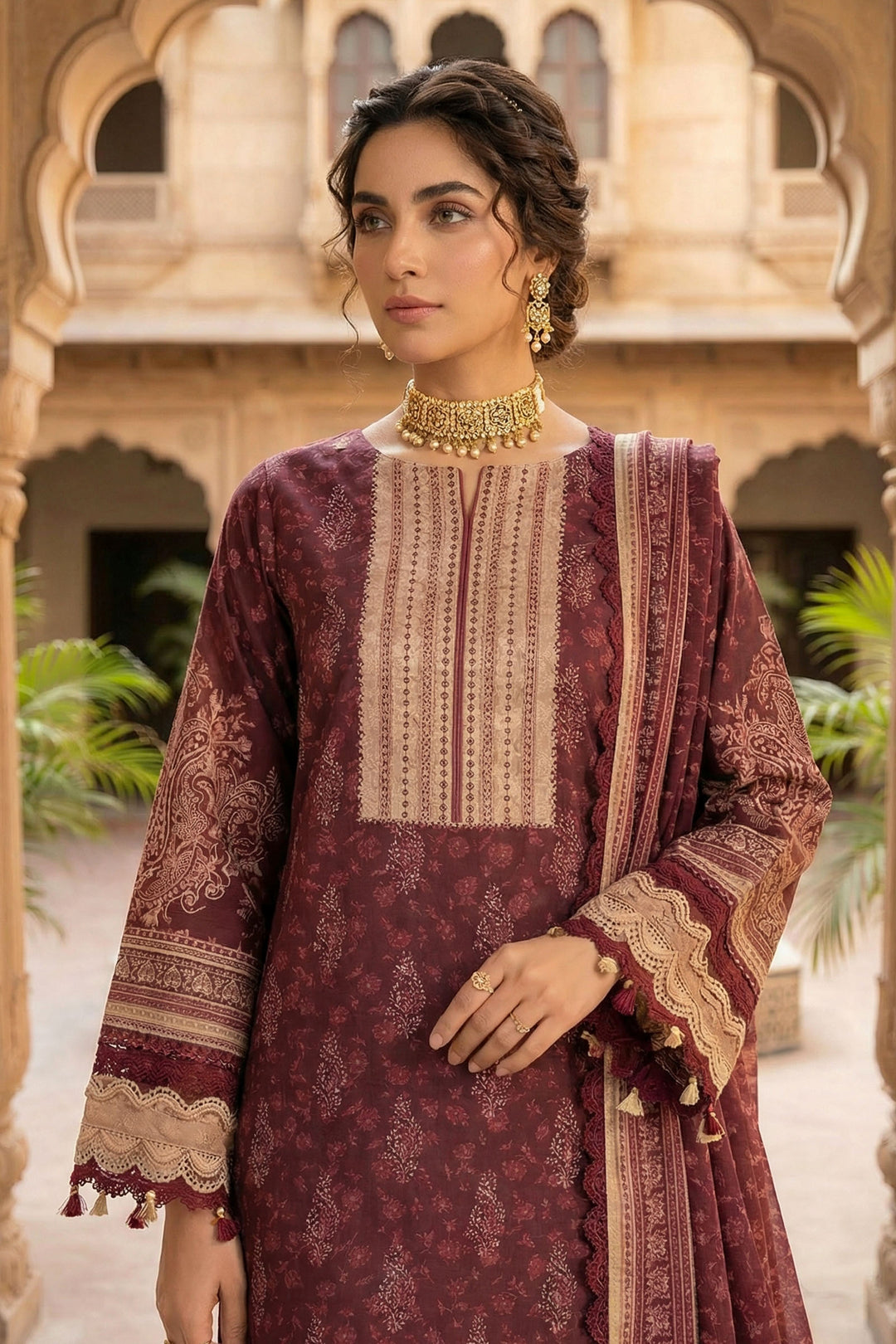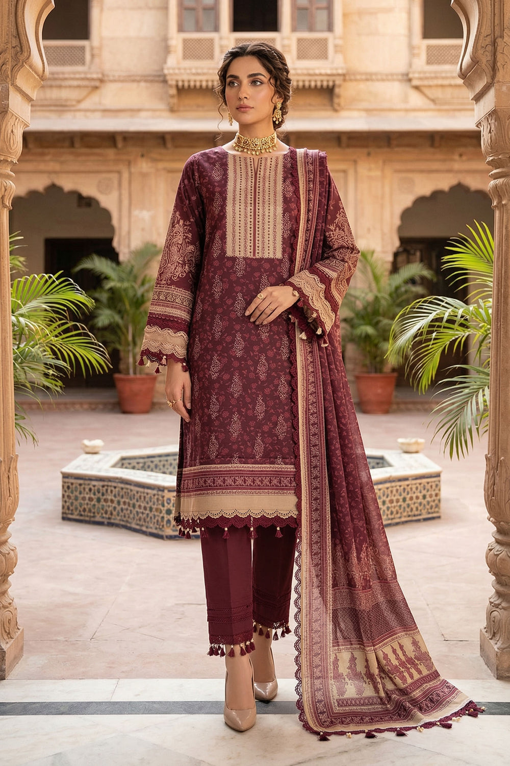 Cordovan Red 3 Piece Unstitched Premium Printed Lawn