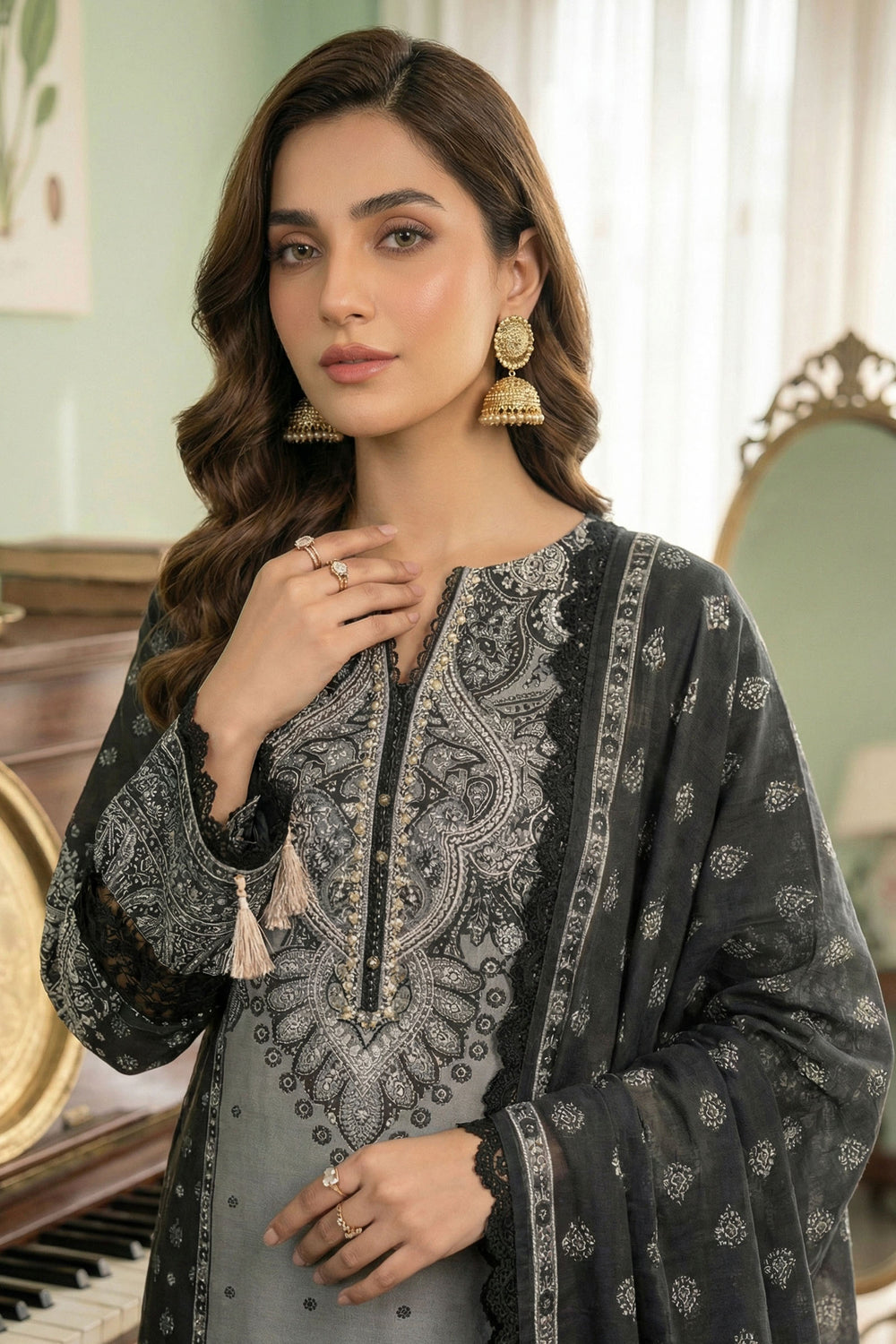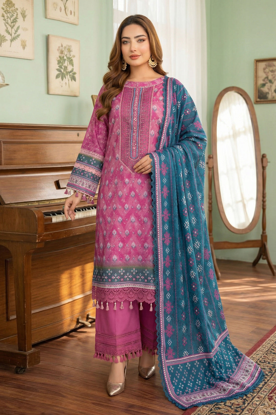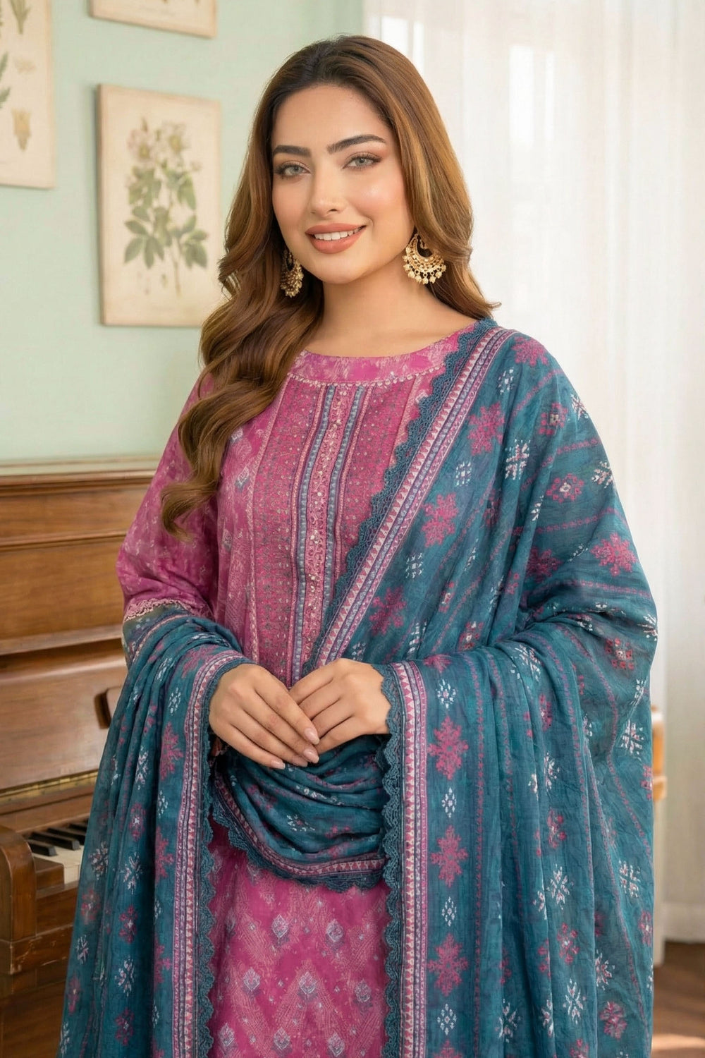 2Pc Hunter Green printed unstitched cambric suits bring bold elegance to summer wardrobes. Designed with a digital printed shirt and trouser, this ladies 2 piece suit offers breathable comfort and versatile styling. Perfect for festive occasions or everyday fashion.
